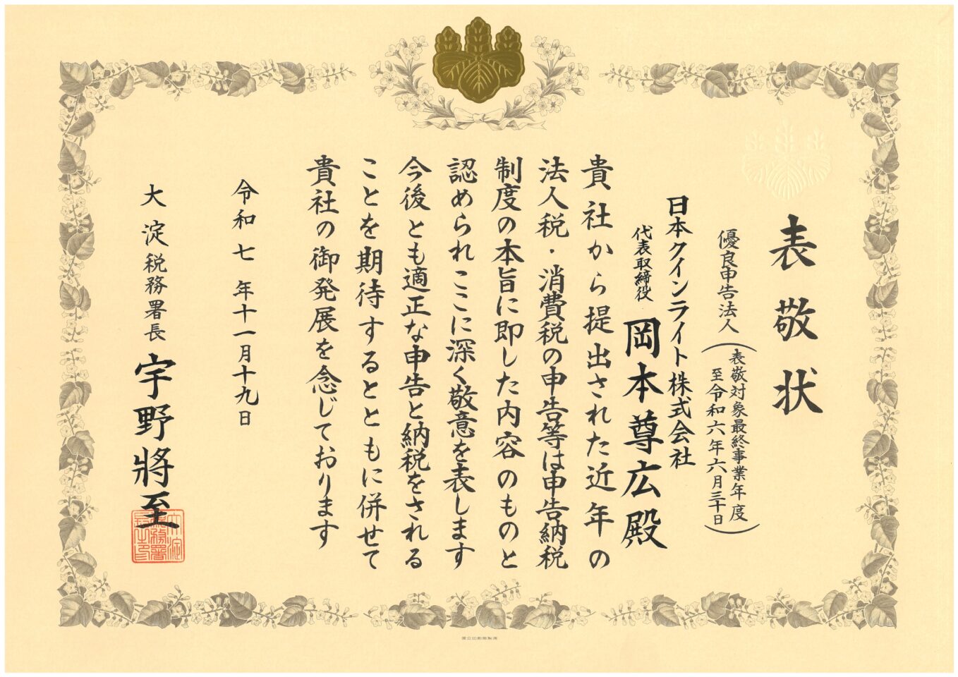 岡本社長が納税思想の向上功績を認められ大阪国税局長表彰を受ける